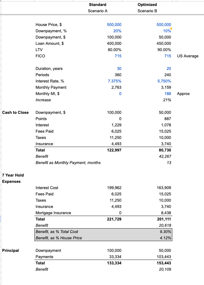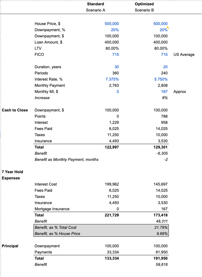Running just four basic scenarios across a single lender, I found two alternatives to the standard 30-year, 20% down mortgage. Both save 5-10% of the house price over seven years (a 10% and 20% drop in the total cost of the mortgage, respectively). Any loan officer could do this, but it’s more work and makes their fees transparent, so they prefer rack rate.